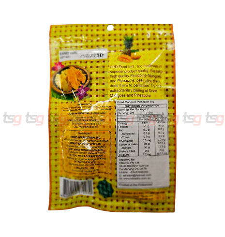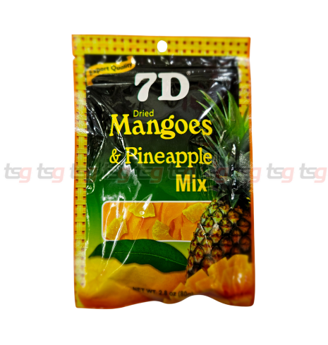 7D Dried Mango & Pineapple Mix brings together two of the Philippines’ most beloved fruits – golden mangoes and juicy pineapples – both carefully dried to retain their natural sweetness and chewy texture. This vibrant blend offers a balance of tangy, sweet, and fruity flavours that’s both refreshing and satisfying.
